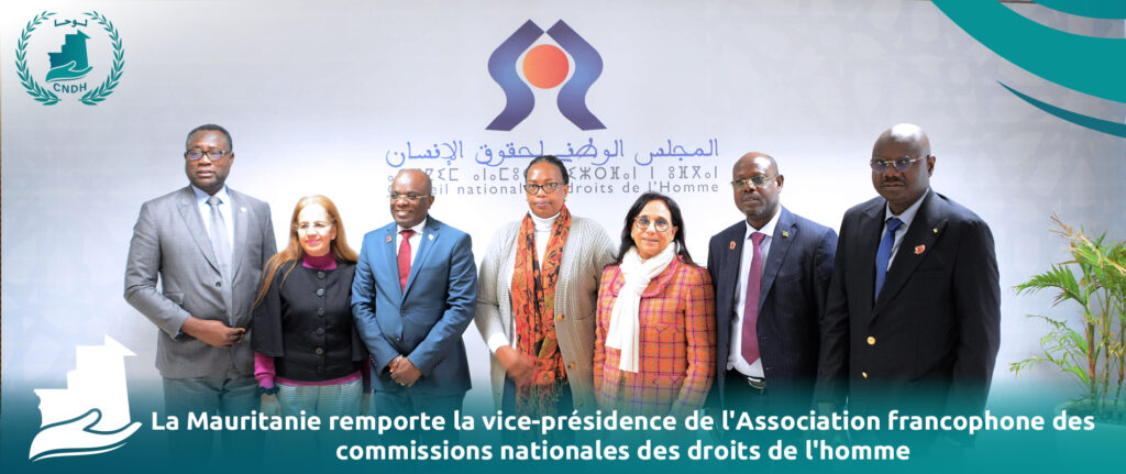 La Mauritanie, représentée par sa Commission Nationale des Droits de l’Homme (CNDH), a remporté hier la vice-présidence de l’Association Francophone des Commissions Nationales des Droits de l’Homme (AFCNDH) et a simultanément obtenu un siège au sein de son bureau exécutif, à l’issue de la 7ème Congrès international de l’Association, qui s’est tenue les 16 et 17 décembre à Rabat, au Maroc.